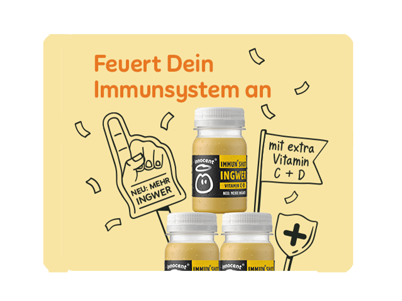 Ingwer hier, der gerne mit dem Feuer spielt? Unsere kleinsten Fläschchen sind prall gefüllt mit scharfem Ingwer und extra Vitaminen. Das brennt ein bisschen auf der Zunge und feuert dein Immunsystem ordentlich an. Unsere Immun Shots gibt es jetzt in neuer Rezeptur nur mit Ingwer oder mit Ingwer und Kurkuma. Aufschrauben und runter damit.