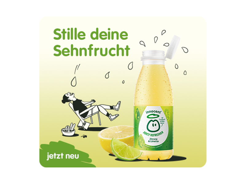 Stell Dir mal vor, Du bist so richtig durstig. Wie, zum Beispiel, nach einer ganzen Packung Knäckebrot in der Wüste. Und dann stell Dir eine Flasche innocent Juicy Refresher vor. Kühl, frisch, fruchtig und erfrischend wie ein Bad in einem Sommergebirgsbach. Den neuen innocent Juicy Refresher gibt es in den Sorten „Zitrone & Limette“ und „Himbeere & Schwarze Johannisbeere“. Welche davon noch erfrischenderererer ist als die andere, findest Du am besten selbst heraus.