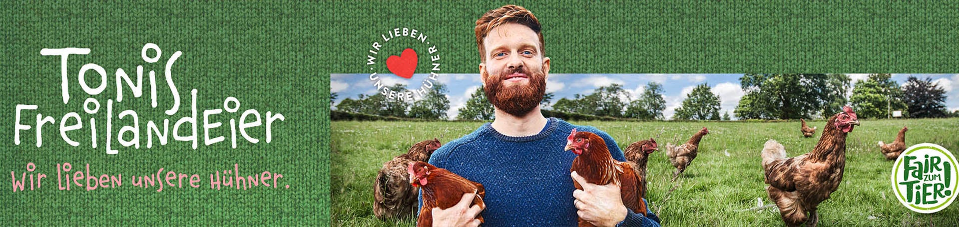Für Tonis Freilandeier® ist die artgemäße Tierhaltung seit jeher ein großes Anliegen. Diese liegt deutlich über dem gesetzlich vorgegebenen Standard, daher sind die Tonis Freilandhühner schon immer schon etwas freier als frei. Sie haben die Freiheit, das zu tun, was sie am liebsten machen. Es wird den ganzen Tag im Hühnergarten nach Futter gepickt, gescharrt und im Sand gebadet. Deshalb werden die Tonis Freilandeier auch mit dem „Fair zum Tier Label“ ausgezeichnet.
