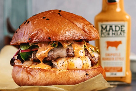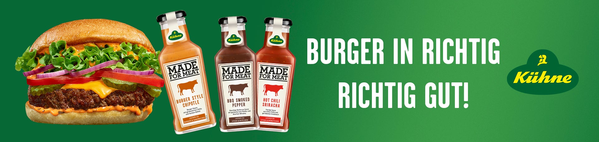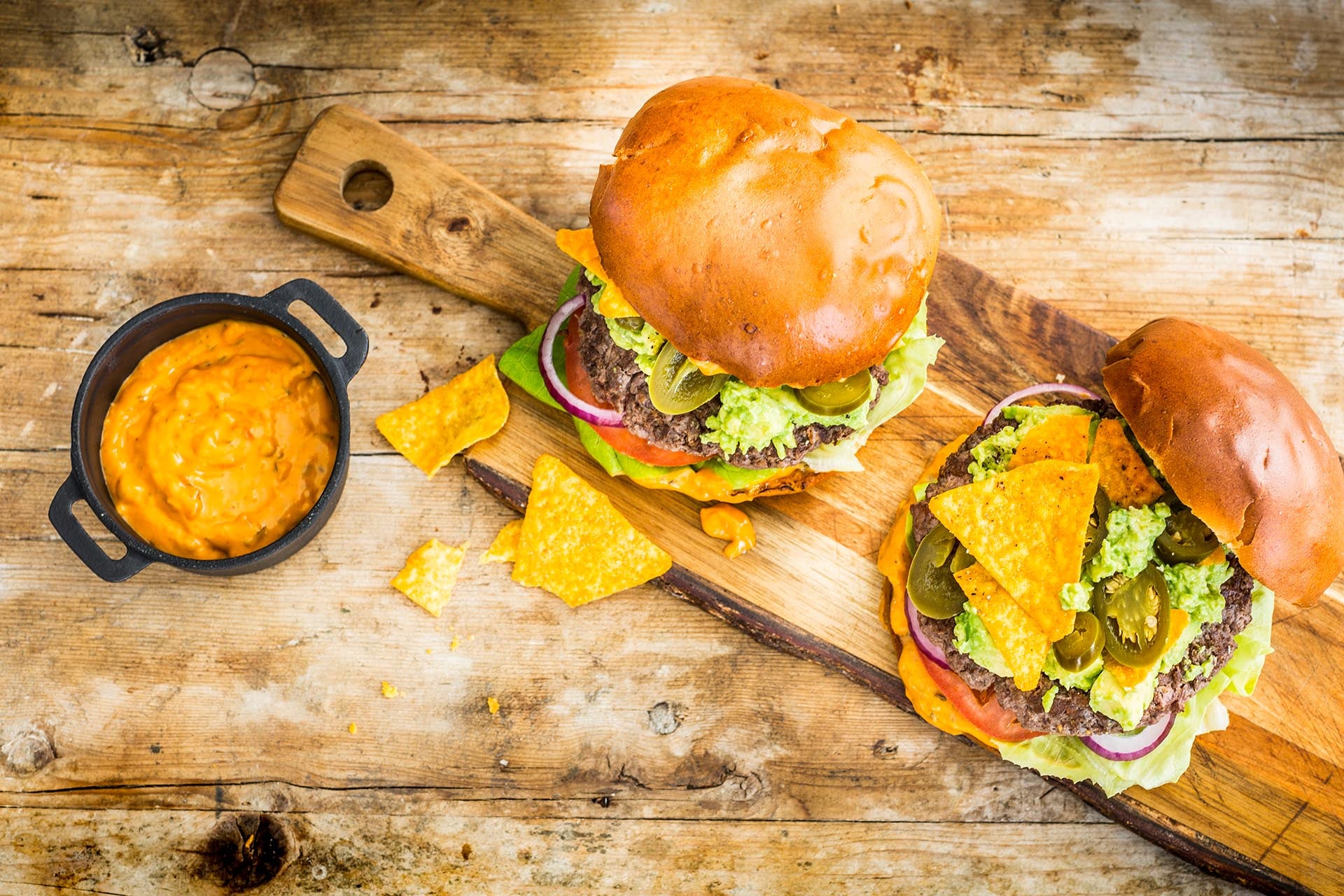 Untere Brötchenhälften mit Kühne MADE FOR MEAT Chipotle Burger Style Sauce bestreichen und mit Salat, Tomatenscheiben und roten Zwiebeln belegen. Burger-Pattys draufsetzen und mit Avocadocreme bestreichen. Tortilla-Chips grob zerbrechen und mit Jalapeños darauf verteilen. Restliche Kühne MADE FOR MEAT Chipotle Burger Style Sauce verteilen und mit oberer Brötchenhälfte abschließen.
