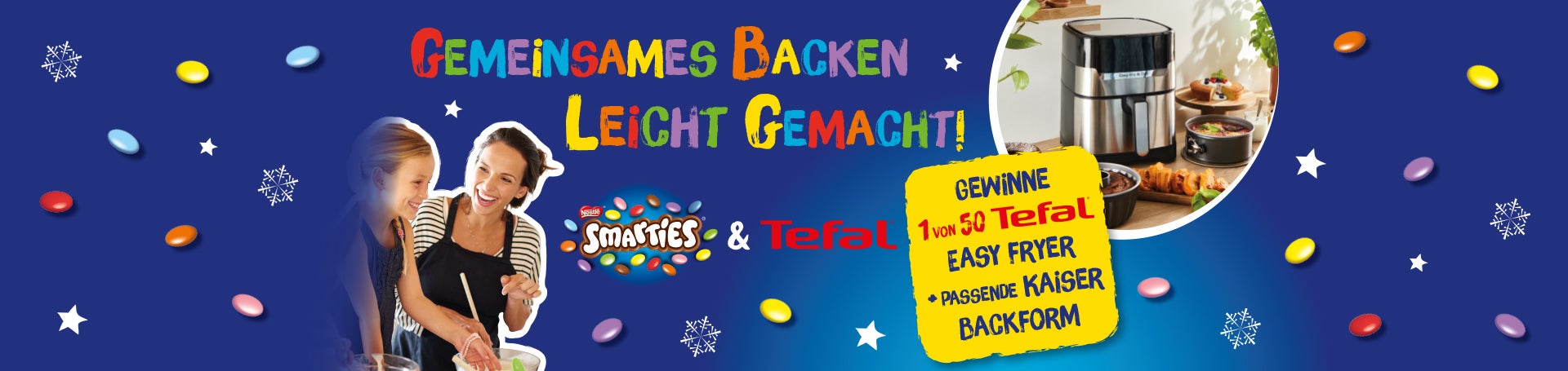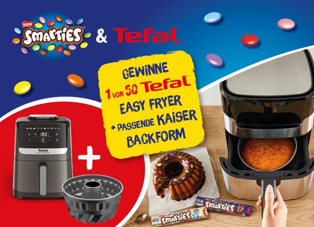 Die festliche Backzeit macht doppelt Freude – besonders mit SMARTIES und Tefal. Gemeinsam Weihnachtsleckereien zaubern und Zeit miteinander genießen wird so zum bunten Familien-Event. Gewinne mit etwas Glück einen Airfryer für besonders einfaches Backen – zusammen mit einer passenden Kaiser Backform im Wert von 320 Euro. Jetzt SMARTIES Aktionsprodukt* sichern und die Chance auf ein buntes Weihnachtsback-Erlebnis nicht verpassen.