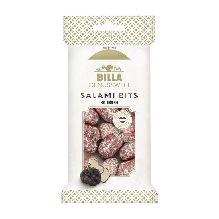 Für 100 g Salami Bits Trüffel werden 174 g Schweinefleisch und 2g Trüffel verwendet.