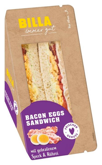 Zutaten: Weizenbrot (WEIZENMEHL, Wasser, Hefe, Speisesalz, Sonnenblumenöl, Zucker, WEIZENGLUTEN, ROGGENMEHL, SOJAMEHL, Säureregulatoren: Milchsäure, Essigsäure; Emulgatoren: Mono- und Diacetylweinsäureester von Mono- und Diglyceriden von Speisefettsäuren, Mono- und Diglyceride von Speisefettsäuren), 21% Eierspeise (76% EIER, MILCH, OBERS, JOGHURT, WEIZENMEHL, BUTTERREINFETT, Maisstärke, Speisesalz, Gewürze), Tomaten, Frischkäsezubereitung (MILCH, Speisesalz, Säuerungskulturen, mikrobielles Lab, Verdickungsmittel: Guarkernmehl), 5% Speck gebraten [Schweinefleisch, Nitritpökelsalz (Speisesalz, Konservierungsstoff: Natriumnitrit), Buchenholzrauch], Rapsöl, Bärlauch, Knoblauch, Speisesalz, Zucker, Weingeistessig, modifizierte Stärke, Dextrose, SENFKORN gemahlen, Gewürze, Konservierungsstoff: Kaliumsorbat; Säuerungsmittel: Milchsäure; Säureregulatoren: Natriumacetat, Natriumcarbonat; Verdickungsmittel: Xanthan, Guarkernmehl, Johannisbrotkernmehl.
