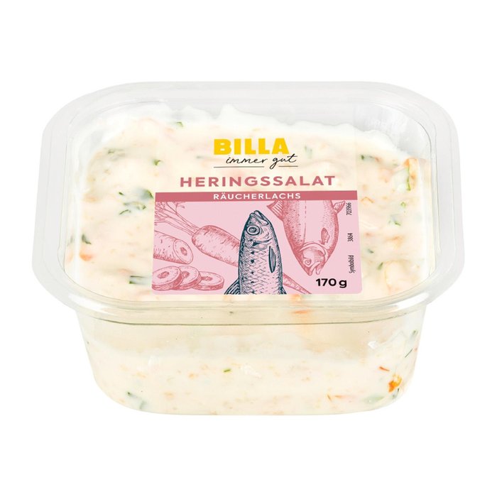 Zutaten: 32% Heringshappen mariniert (HERINGSFILET, Zucker, Speisesalz, Säuerungsmittel: Essigsäure), Wasser, Rapsöl, 11% Lachs geräuchert (LACHS, Speisesalz, Rauch), 10% Karotten, Zucker, Weingeistessig, Schnittlauch, Speisesalz, MAGERMILCHJOGHURTPULVER, modifizierte Stärke, EIGELBPULVER, Krenzubereitung (Kren, Wasser, Weingeistessig, Rapsöl, Antioxidationsmittel: Ascorbinsäure, NATRIUMMETABISULFIT), SENFKORN gemahlen, Gewürze, Konservierungsstoff: Kaliumsorbat; Säuerungsmittel: Milchsäure; Säureregulatoren: Natriumacetat, Natriumcarbonat; Verdickungsmittel: Xanthan, Guarkernmehl; Glukosesirup, Maltodextrin, Rauchsalz (Speisesalz, Rauch).