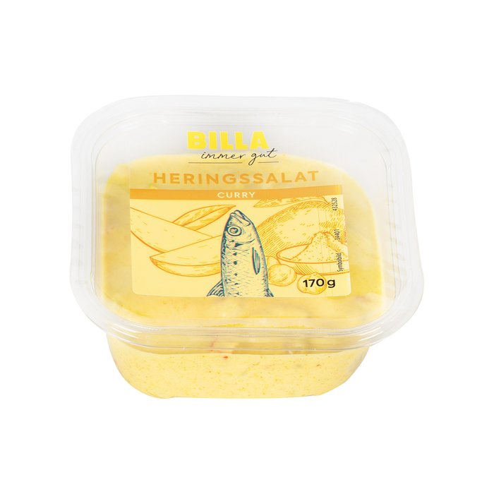 Zutaten: 35% Heringshappen mariniert (HERINGSFILET, Zucker, Speisesalz, Säuerungsmittel: Essigsäure), Wasser, Rapsöl, 11% Kichererbsen gekocht (Wasser, Kichererbsen), 9% Mangopulpe, Pfirsich eingelegt (Pfirsiche, Wasser, Zucker, Glukose-Fruktose-Sirup, Säuerungsmittel: Citronensäure), Paprika, Lauch, Zucker, 0,9% Curry-Gewürz, Weingeistessig, Zitronensaftkonzentrat, Speisesalz, Krenzubereitung (Kren, Wasser, Weingeistessig, Rapsöl, Antioxidationsmittel: Ascorbinsäure, NATRIUMMETABISULFIT), EIGELBPULVER, SENFKORN gemahlen, Gewürze, modifizierte Stärke, Säuerungsmittel: Milchsäure; Konservierungsstoff: Kaliumsorbat; Säureregulatoren: Natriumacetat, Natriumcarbonat; Verdickungsmittel: Xanthan, Guarkernmehl; Süßungsmittel: Saccharin.