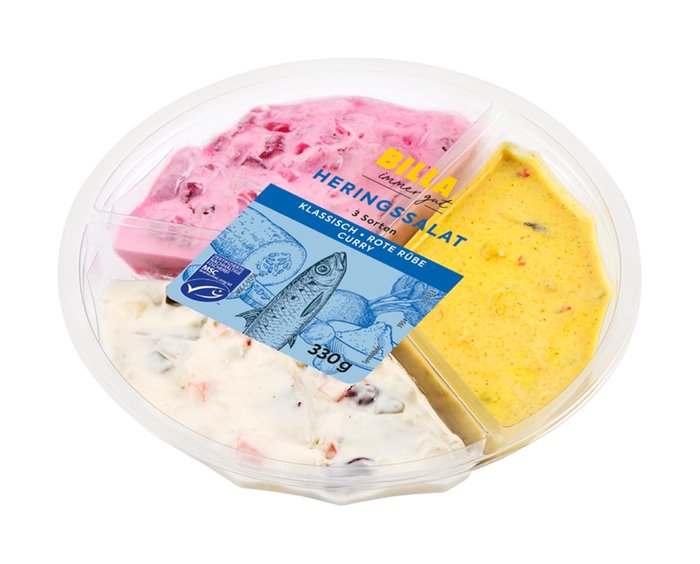 Feinkostsalat mit Hering und Curry. Mit Zuckern und Süßungsmittel. Zutaten: 35% Heringshappen mariniert (HERINGSFILET*, Zucker, Speisesalz, Säuerungsmittel: Essigsäure), Wasser, Rapsöl, 11% Kichererbsen gekocht (Wasser, Kichererbsen), Mangopulpe, Pfirsich eingelegt (Pfirsiche, Wasser, Zucker, Glukose-Fruktose-Sirup, Säuerungsmittel: Citronensäure), Paprika, Lauch, Zucker, 0,9% Curry-Gewürz, Weingeistessig, Zitronensaftkonzentrat, Speisesalz, Krenzubereitung (Kren, Wasser, Weingeistessig, Rapsöl, Antioxidationsmittel: Ascorbinsäure, NATRIUMMETABISULFIT), EIGELBPULVER, SENFKORN gemahlen, Gewürze, modifizierte Stärke, Säuerungsmittel: Milchsäure; Konservierungsstoff: Kaliumsorbat; Säureregulatoren: Natriumacetat, Natriumcarbonat; Verdickungsmittel: Xanthan, Guarkernmehl; Süßungsmittel: Saccharin.