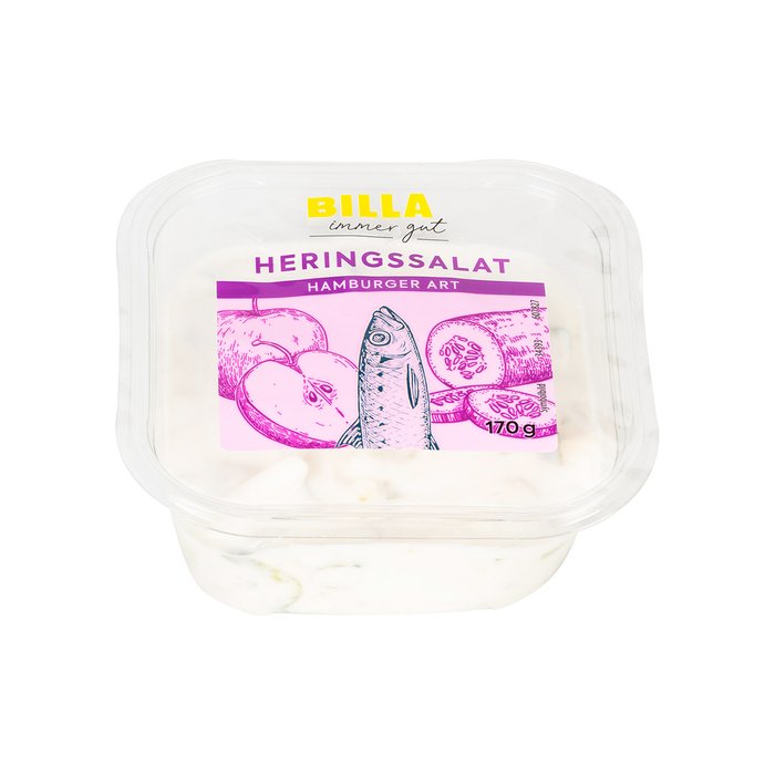 Zutaten: 45% Heringshappen mariniert (HERINGSFILET, Zucker, Speisesalz, Säuerungsmittel: Essigsäure), 15% Gurke, Wasser, Rapsöl, 5% Äpfel, SAUERRAHM 15% Fett, Zwiebel, Zucker, modifizierte Stärke, Weingeistessig, Speisesalz, EIGELBPULVER, SENFKORN, Gewürze, Verdickungsmittel: Guarkernmehl, Xanthan; Säuerungsmittel: Milchsäure, Citronensäure, Essigsäure; Säureregulatoren: Natriumacetate, Natriumcarbonate; Konservierungsstoff: Kaliumsorbat; Antioxidationsmittel: Ascorbinsäure; Süßungsmittel: Saccharin.