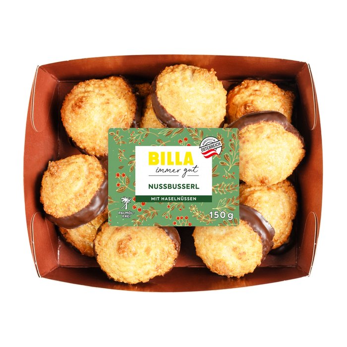 Zutaten: Zucker, HASELNÜSSE 15%, Glukosesirup, Kokosraspeln, Kakaomasse¹ 8,7%, HÜHNEREIEIWEISS² 7,9%, Feuchthaltemittel: Sorbit; Dextrose, Kakaobutter¹ 2,6%, Reismehl, Invertzuckersirup, Emulgator: Lecithine.