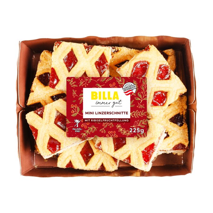 Zutaten: Ribiselfruchtfüllung 35% (Rote Ribisel 14%¹, Zucker, Feuchthaltemittel: Sorbit; modifizierte Stärke, Geliermittel: Pektine; Säuerungsmittel: Citronensäure; Konservierungsstoff: Kaliumsorbat), WEIZENMEHL, Zucker, HASELNÜSSE 7%, HÜHNERVOLLEI² 4,9%, Sonnenblumenöl, Kokosfett ganz gehärtet, Rapsöl ganz gehärtet, Rapsöl, Kokosfett, Kartoffelstärke, Glukosesirup, Zimt, Speisesalz, Aroma, Konservierungsstoff: Sorbinsäure; Säuerungsmittel: Citronensäure.