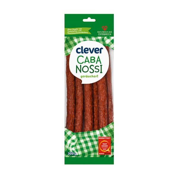 Zutaten: 150 g Schweine- und Rindfleisch für 100g Enderzeugnis, Speck, Speisesalz, Gewürze, Dextrose, Knoblauch, Zucker, Antioxidationsmittel: Ascorbinsäure; Stabilisator: Diphosphate; Konservierungsstoff: Natriumnitrit; Gewürzextrakte, Rindercollagenhülle, Buchenrauch.