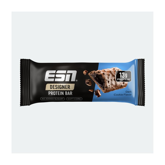 Riegel mit 29 % Eiweiß und 29 % Milchschokoladenüberzug. Mit Süßungsmitteln. Geschmack: Dunkler Keks.