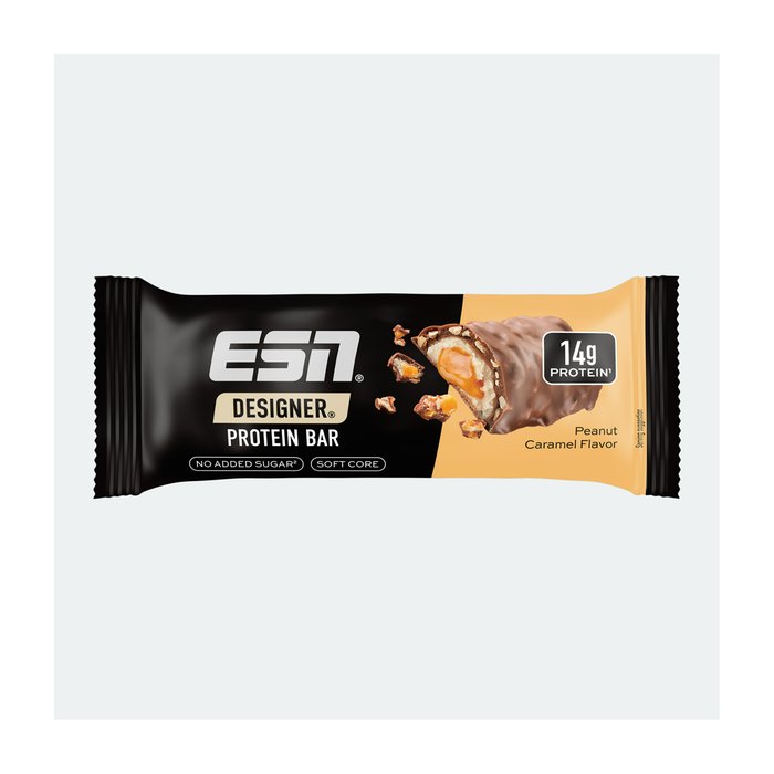 Riegel mit 31 % Eiweiß und 33 % Milchschokoladenüberzug. Mit Süßungsmitteln. Geschmack: Erdnuss-Karamell.
