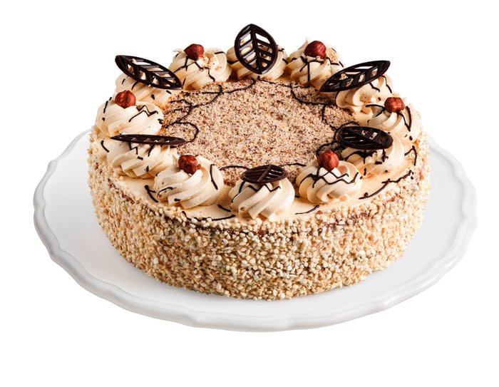 40% Nussbuttercreme (BUTTER, Zucker, 8% HASELNÜSSE, modifizierte Stärke, MOLKENPULVER, MAGERMILCHPULVER, Dextrose, pflanzliche Öle und Fette (Kokos, Palm), Stabilisator (E516, E339,E450), Glukosesirup getrocknet, Maisstärke, Emulgator (E472b), Verdickungsmittel (E401), LAKTOSE, MILCHEIWEISS, Salz, Farbstoff (E160b (ii), E101), Aroma (enthäkt LAKTOSE, HASELNÜSSE)); 38% Nusstortenboden (VOLLEI, Zucker, WEIZENMEHL, HÜHNEREIEIWEISS, WALNÜSSE (9%), Stärke (enthält WEIZEN), Sonnenblumenöl, Rapsöl, HASELNÜSSE (5%), Aroma, SÜSSMOLKENPULVER, Salz, Gewürze, Farbstoff: beta-Carotin); 15% Dekor (20% HASELNÜSSE, Zucker, Puffreis, pflanzliche Fette teilweise gehärtet (Palm, Kokos), Kakao, Emulgator: Lecithine (enthält SOJA), Vanillin, Kakaomasse, natürliches Vanillearoma, Kakaopulver stark entölt); Marillenkonfitüre (Glukose-Fruktose-Sirup, Aprikosenpüree, Zucker, Geliermittel: Pektin, Säuerungsmittel: Citronensäure, Aromastoff, Konservierungsstoff: Kaliumsorbat).