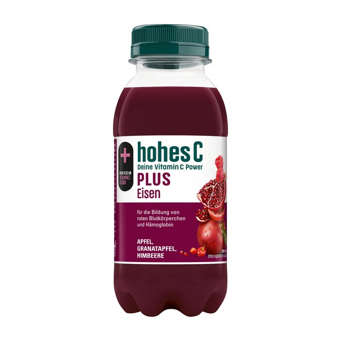 Zutaten: Mehrfruchtsaft aus Fruchtsaftkonzentraten (Apfel 80%, Tomate 4,5%, Granatapfel 4%, Acerola 3%, Zitrone), Schwarzkarottensaft aus Schwarzkarottensaftkonzentrat 6,5%, Himbeerpüree 1,5%, Eisen-II-Gluconat.