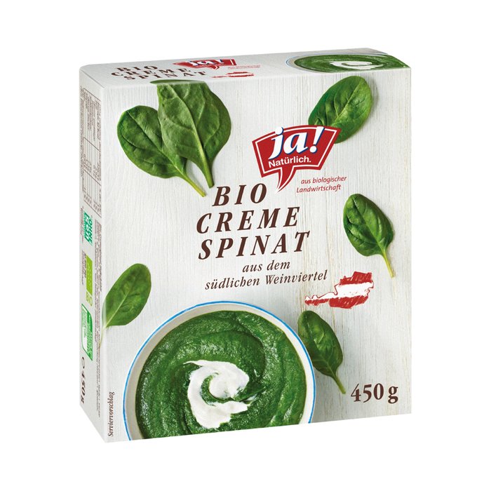Den gefrorenen Ja! Natürlich Bio-Cremespinat in ein mikrowellengeeignetes Gefäß geben und zugedeckt bei 600 Watt ca. 6 Minuten garen. Den Block zerteilen und für weitere 6 Minuten erhitzen. Zwischendurch umrühren.
