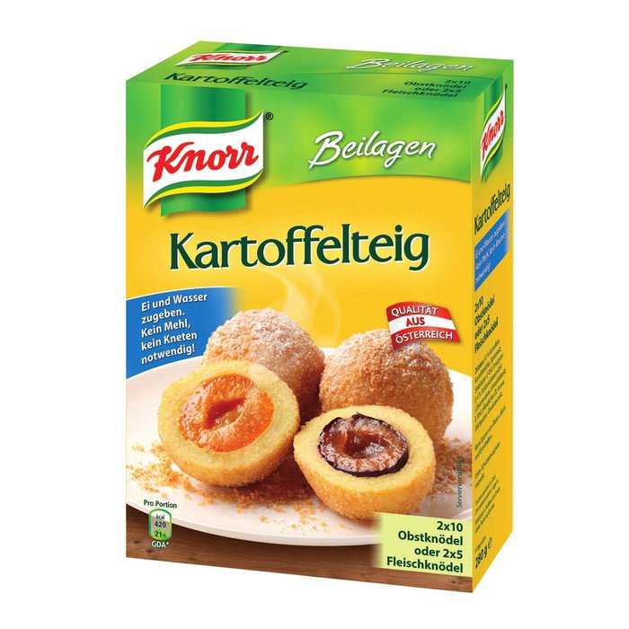 Zubereitung 1 Beutel (für ca. 9 Obst- oder 6 Fleischknödel - die Anzahl der Knödel ist abhängig von der Größe der Fülle bzw. von der Teigdicke): 1. 1 Ei in einen Messbecher geben und mit kaltem Wasser auf 1/4 Liter (250 ml) auffüllen. 2. Flüssigkeit in eine Schüssel gießen und versprudeln. 3. Beutelinhalt zügig einrühren und 5 Minuten stehen lassen. Nochmals kurz durchrühren. 4. Mit feuchten Händen Knödel formen, in kochendes Salzwasser legen, 5 Minuten leicht kochen und 5 Minuten ziehen lassen. Nach Entnahme einer Teilmenge ist der Restinhalt im wieder gut verschlossenen Beutel noch mindestens 3 Wochen haltbar.