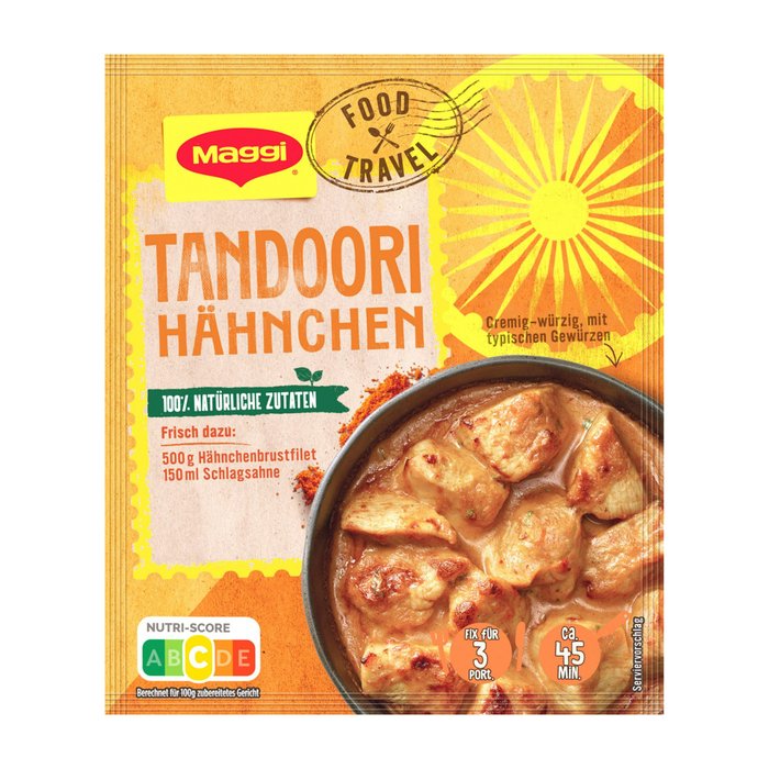 Frisch dazu: 500 g Hähnchenbrustfilet, 150 ml Schlagsahne. Zubereitung: 1. Hähnchenbrust in grobe Stücke schneiden. 2. In einer Schüssel Beutelinhalt in 150 ml Sahne einrühren. Hähnchenstücke dazugeben, alles gut durchmischen und 10 Min. marinieren lassen. 3. Alles in eine Auflaufform (ca. 30 x 20 cm) geben und im vorgeheizten Backofen bei 200°C (Umluft 170°C) ca. 30 Min. garen. Dazu schmeckt Reis oder Naan Brot.