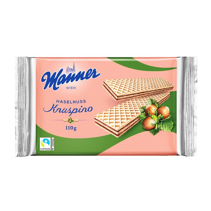 Die Knuspino Waffeln in der Geschmacksrichtung Haselnuss bieten zarten Waffelgenuss in bekannter Manner Qualität. Sie begeistern mit wohldosierter Süße.