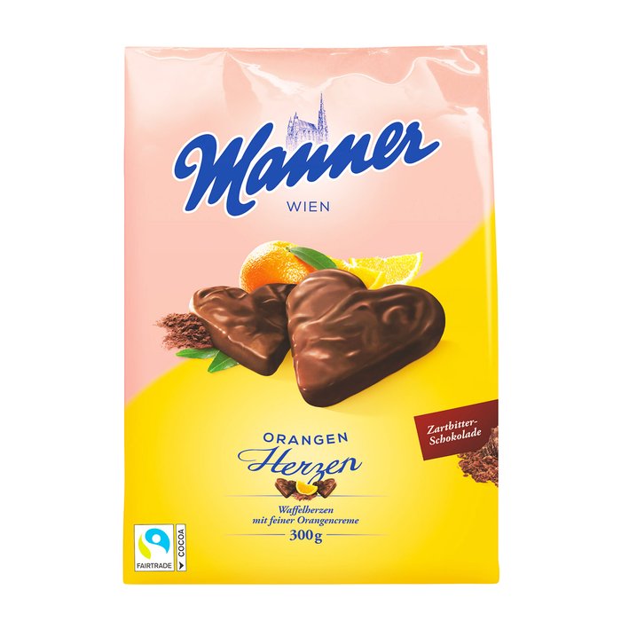Waffeln gefüllt mit Orangencreme (57%), getunkt in Schokolade (32%)