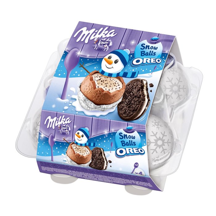 Alpenmilch Schokolade gefüllt mit Milchcrème (41 %) mit Vanillegeschmack und Kakaokeksstückchen (4,5 %).