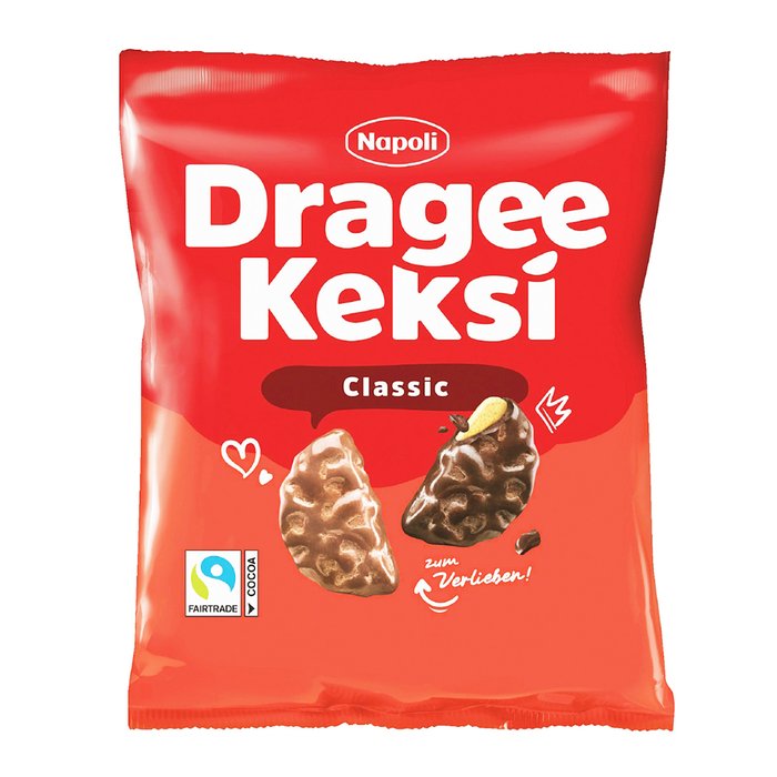 Zutaten: Zucker, WEIZENMEHL, Kakaomasse, Kakaobutter, VOLLMILCHPULVER, Palmfett, SÜSSMOLKENPULVER, Stärke, Glukose-Fruktose-Sirup, Emulgator: Lecithine (SOJA); Überzugsmittel: Gummi arabicum; Feuchthaltemittel: Sorbit; Salz, Backtriebmittel: Natriumhydrogencarbonat, E 503ii; natürliche Aromen. Kann Spuren von Schalenfrüchten enthalten.