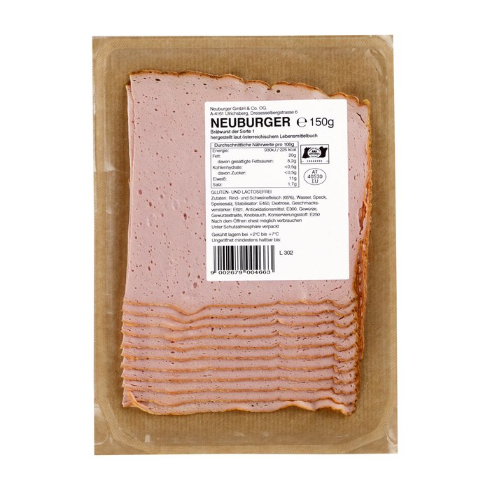 Zutaten: Rind-und Schweinefleisch (65%), Wasser, Speck, Speisesalz, Stabilisator: E450, Dextrose, Geschmacksverstärker: E621, Antioxidationsmittel: E300, Gewürze, Gewürzextrakte, Knoblauch, Konservierungsstoff: E250