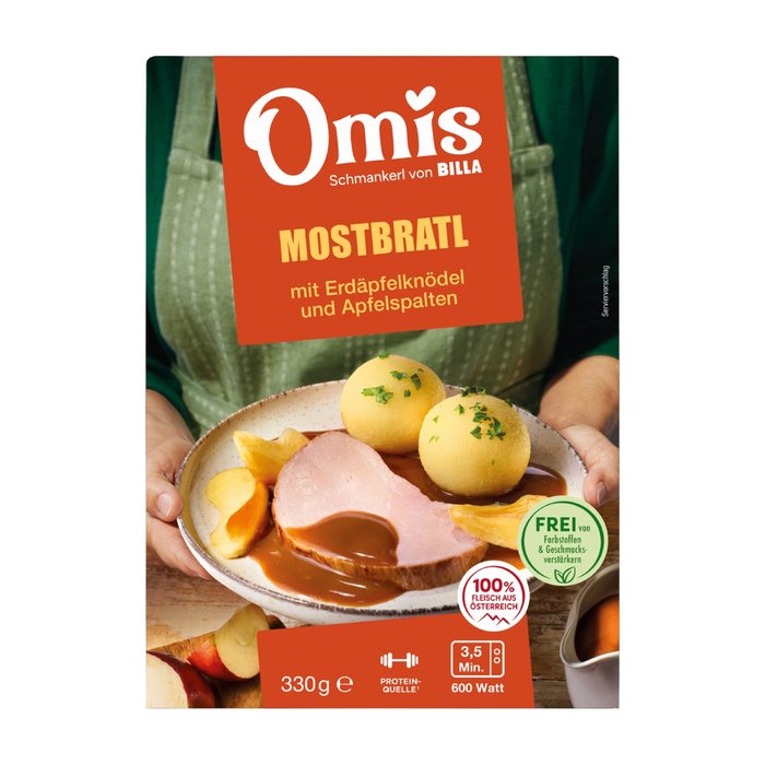 Ein traditionelles Schmankerl: Omis Mostbraten aus heimischem Schweinefleisch wird besonders zart gegart und erhält durch die Verfeinerung mit fruchtigem Most seinen typischen, leicht fruchtigen Geschmack. Serviert mit flaumigen Erdäpfelknödeln und süßen Apfelspalten entsteht ein herzhaftes Gericht, das Wärme und Genuss auf den Teller bringt.