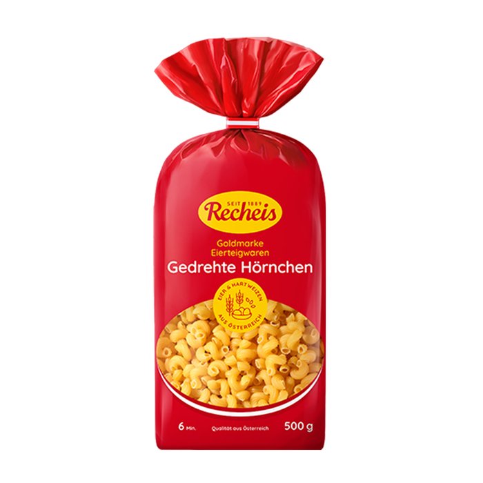 KOCHANLEITUNG: Nudeln in reichlich kochendes, gesalzenes Wasser geben (1 Liter/100 g Nudeln). Öfter umrühren. Nach ca. 6 Minuten sind die Nudeln bissfest gekocht. Dank der Zugabe von besten österreichischen Eiern sind Recheis Nudeln auch nach etwas längerer Kochzeit ein Genuss.