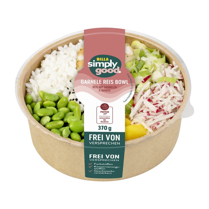 Zutaten: 25% Reis gekocht (Wasser, Reis, Speisesalz), SOJABOHNEN, Radieschen, 13% Mango, 13% Garnelen (WHITE TIGER GARNELEN, Speisesalz), Rapsöl, Jungzwiebelringe, Limette, Speisesalz, EIGELBPULVER, Zucker, Wasabi-Pulver (Kren, Wasabi), Weingeistessig, SESAM, Gewürze, SENFKORN gemahlen, Knoblauch getrocknet, Zitronensaftkonzentrat, Säuerungsmittel: Milchsäure.