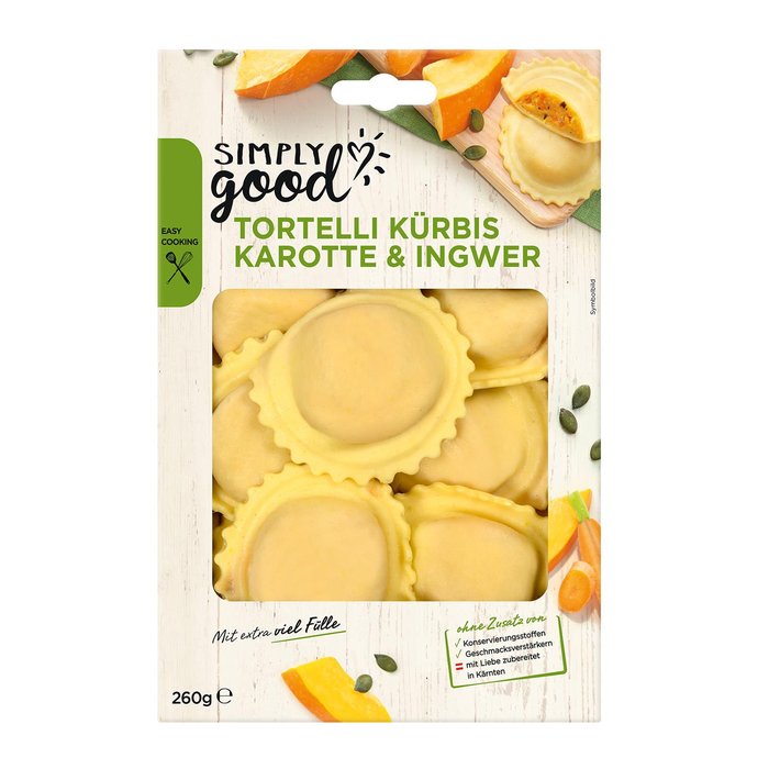 Saisonale Tortelli als kleine Kraftpakete: Die aromatische Fülle aus Kürbis, Karotte und Ingwer ist ein schmackhafter Energiekick. Unsere Simply Good Tortelli Kürbis, Karotte & Ingwer eignen sich perfekt für alle, die von Gemüse nicht genug kriegen können. Der mild-süße Geschmack von Kürbis und Karotte harmoniert wunderbar mit dem leicht scharfen Aroma von Ingwer. Verpackt ist diese Geschmacksexplosion in unseren zarten Tortelli, die ohne Konservierungsstoffe und Geschmacksverstärkern mit viel Liebe in Kärnten zubereitet werden. Schnell zugreifen, da diese Sorte nur saisonal erhältlich ist.