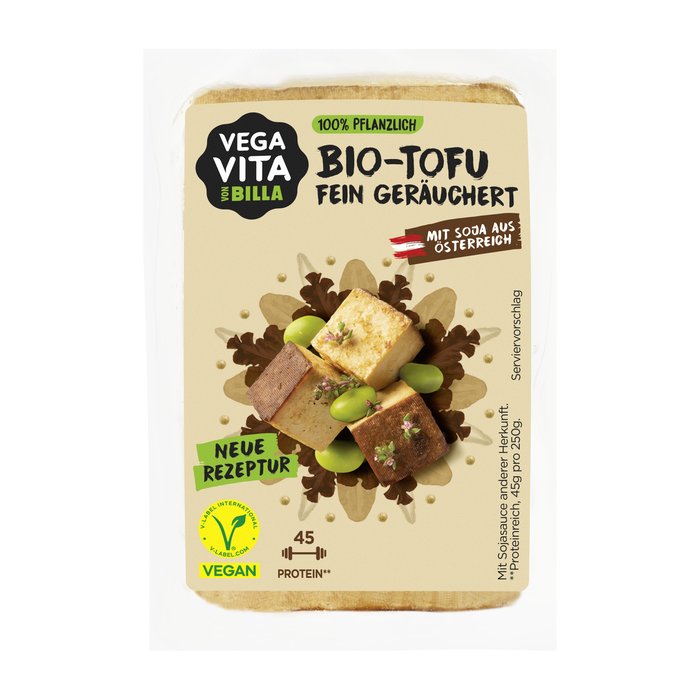 Zutaten: Tofu (Wasser, Sojabohnen* 20%, Calciumsulfat, Nigari), Marinade (Wasser, Sojasauce* (Wasser, Sojabohnen*, Meersalz, Weizen*), Salz, Knoblauch*, Majoran*, Koriander*, Basilikum*), Buchenholzrauch