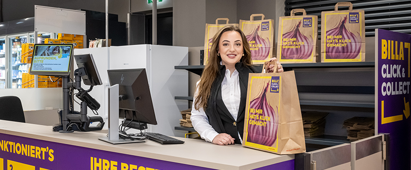 Was wäre, wenn der Einkauf schon beim Ankommen im Supermarkt fertig zusammengepackt warten würde? Dann wäre das unser Click & Collect Service. Hierbei können die gewünschten Lebensmittel im Vorfeld online bestellt und dann frisch und fertig verpackt in einem selbstgewählten BILLA Markt in der Nähe abgeholt werden. Hier haben wir alle Infos zu Click & Collect zusammengefasst.