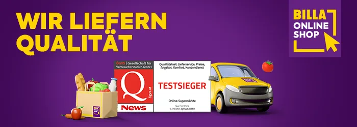 Gratis Lieferung: Gültig von 6.10.2025 bis 30.11.2025. Mindestbestellwert 39 €. Nicht kombinierbar mit anderen Aktionen. Nicht in bar ablösbar. Nur gültig im BILLA Online Shop. Es gelten die AGB der BILLA AG, abrufbar unter www.billa.at.